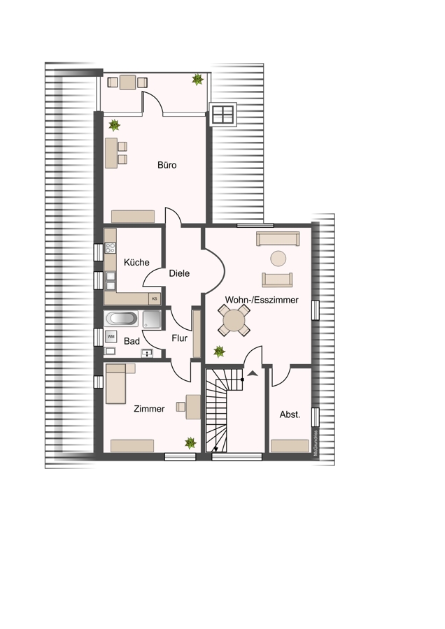 Die stilvolle Studiowohnung besticht durch ihre offene Raumgestaltung, helle Wohnbereiche und eine moderne Ausstattung. Neben Wohn- und Esszimmer bietet sie ein Schlafzimmer, ein Büro-/Fernsehzimmer, eine Küche, ein Bad und einen praktischen Abstellraum.