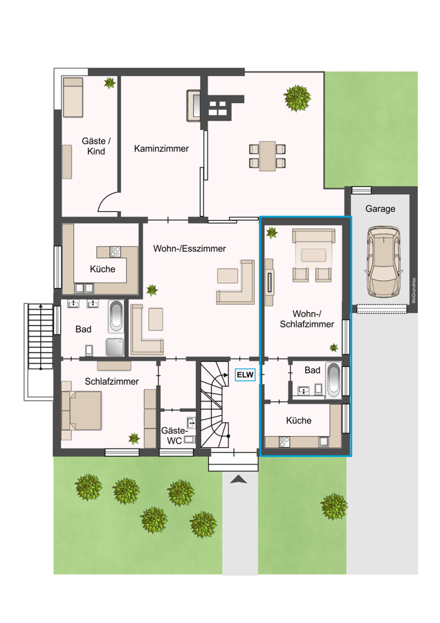 - Eigenständige Einheit mit Wohn-/Schlafbereich, Küche und Bad