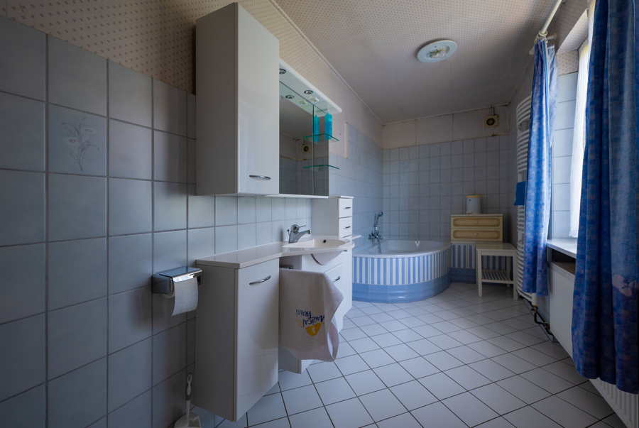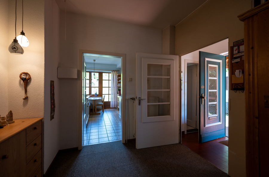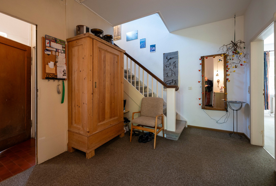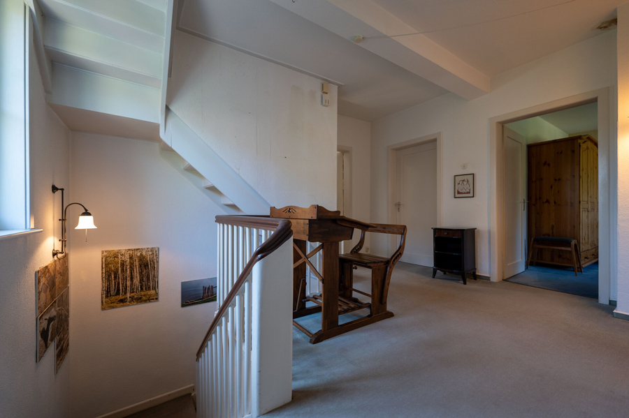 Im Dachgeschoss befinden sich zwei große und ein kleineres Zimmer, ein geräumiges Badezimmer sowie ein weiterer Raum, der ursprünglich als Küche vorgesehen war, aber seit vielen Jahren als Gäste- und Wäschezimmer dient. Über eine schmale Treppe gelangt man auf den Dachboden, der reichlich Stauraum bietet und zusätzliches Ausbaupotenzial bereithält.