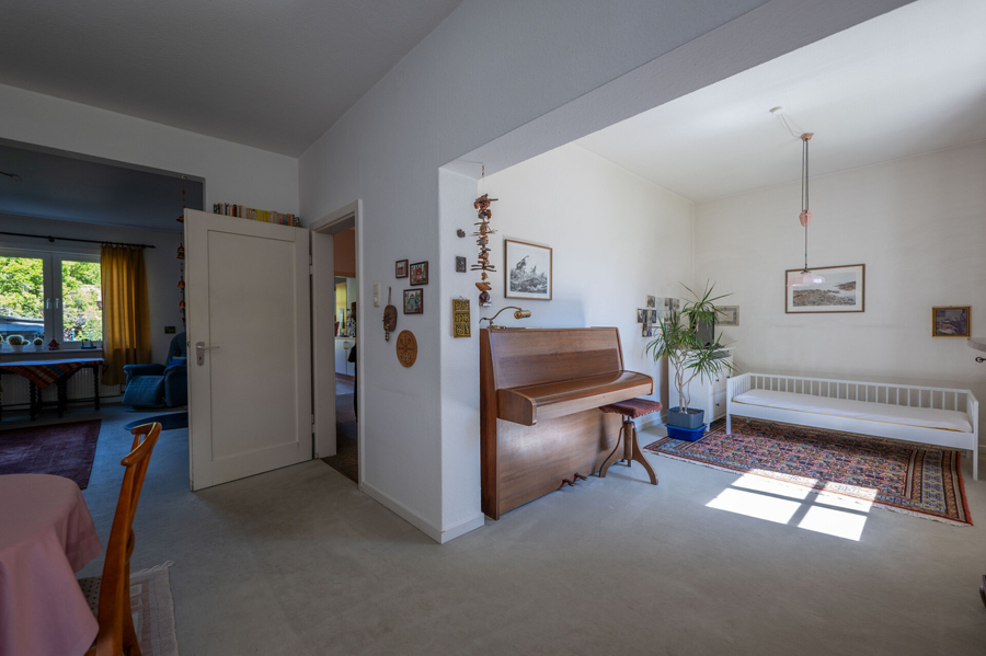 Im Keller stehen ein Wirtschaftsraum mit Waschmaschine und Trockenbereich, zwei weitere Räume sowie der Heizungsraum zur Verfügung. Das Erdgeschoss überzeugt mit einem hellen, über Eck gestalteten Wohnzimmer, das durch mehrere Sitzbereiche und einen skandinavischen Kaminofen Gemütlichkeit ausstrahlt. Eine Küche mit Einbauelementen und Zugang in den Garten, ein Flur sowie ein kleines Duschbad runden diese Ebene ab.