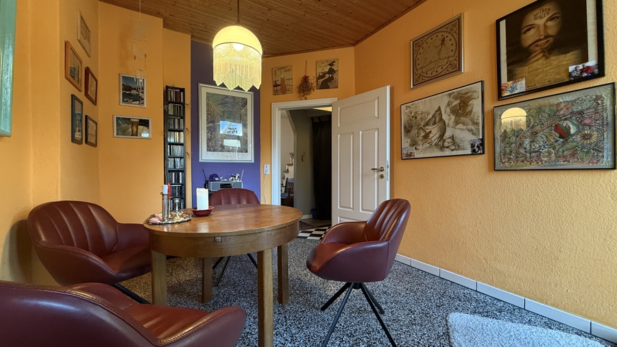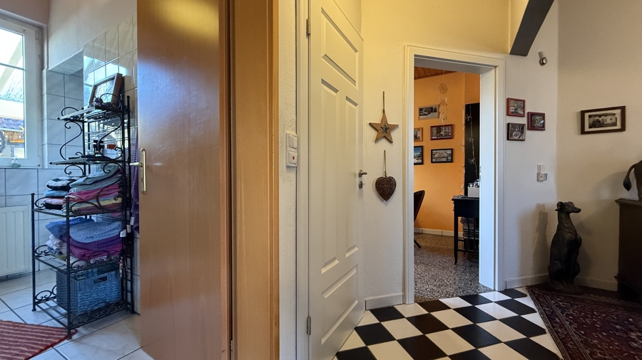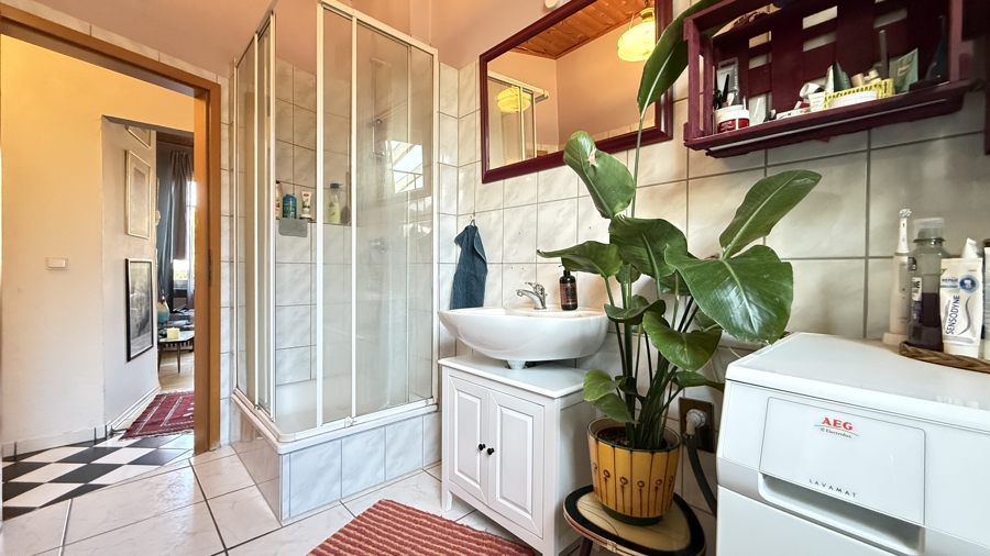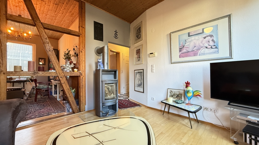 Auf der linken Seite wartet das gemütliche Wohnzimmer mit einem stimmungsvollen Ofen und freigelegtem Fachwerk als elegantem Raumtrenner – ein Ort zum Entspannen und Genießen. Direkt daneben liegt das zentral platzierte Duschbad des Erdgeschosses. Vom Flur aus besteht auch Zugang zum Teilkeller mit der Gastherme und wertvollem Abstellraum.