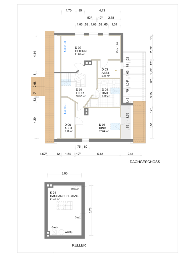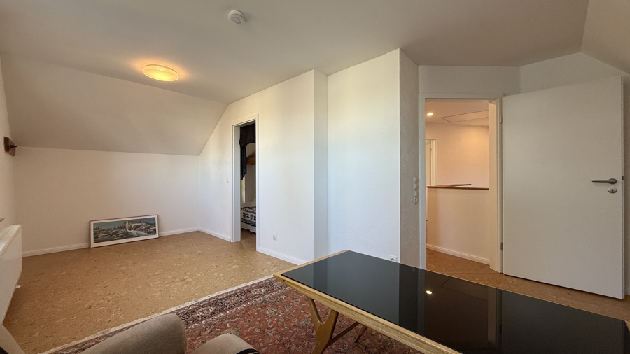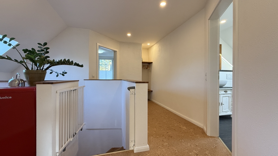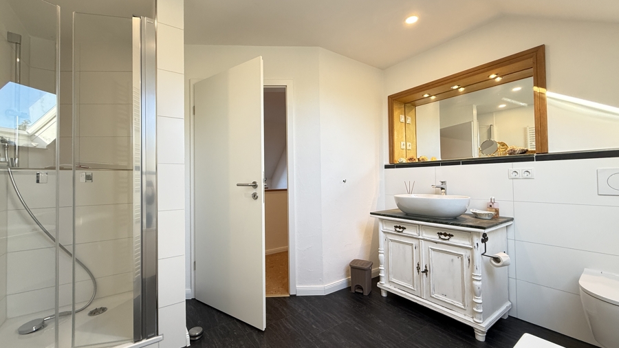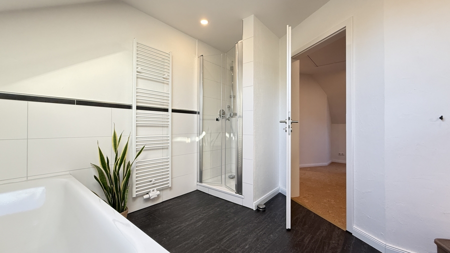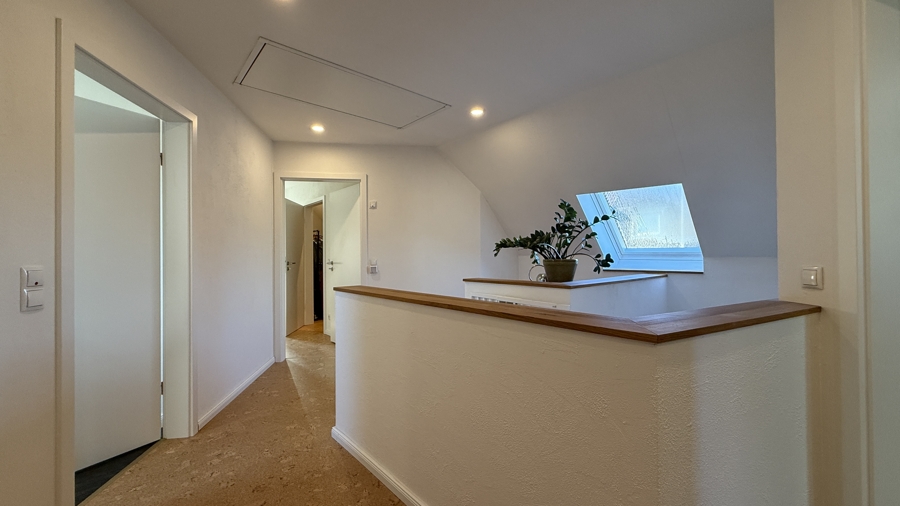 Eine moderne Treppe mit edlen Eichenbohlenstufen, direkt links neben der Haustür gelegen, führt ins großzügig ausgestattete Dachgeschoss. Hier erwarten zwei großzügige Schlafzimmer höchsten Komforts: eines mit praktischem Nebenraum als Ankleide oder Nische, das andere mit begehbarem Kleiderschrank für perfekte Ordnung. Das moderne Vollbad mit Wanne und Dusche rundet diese Etage stilvoll ab.