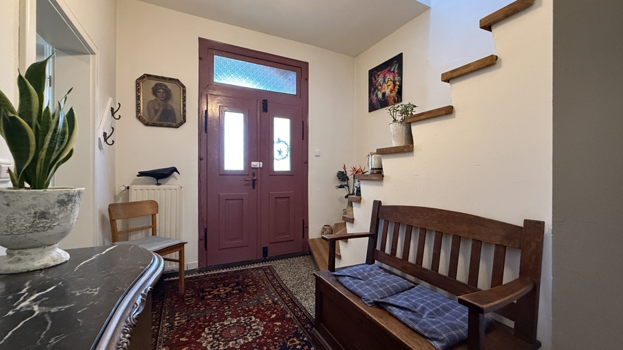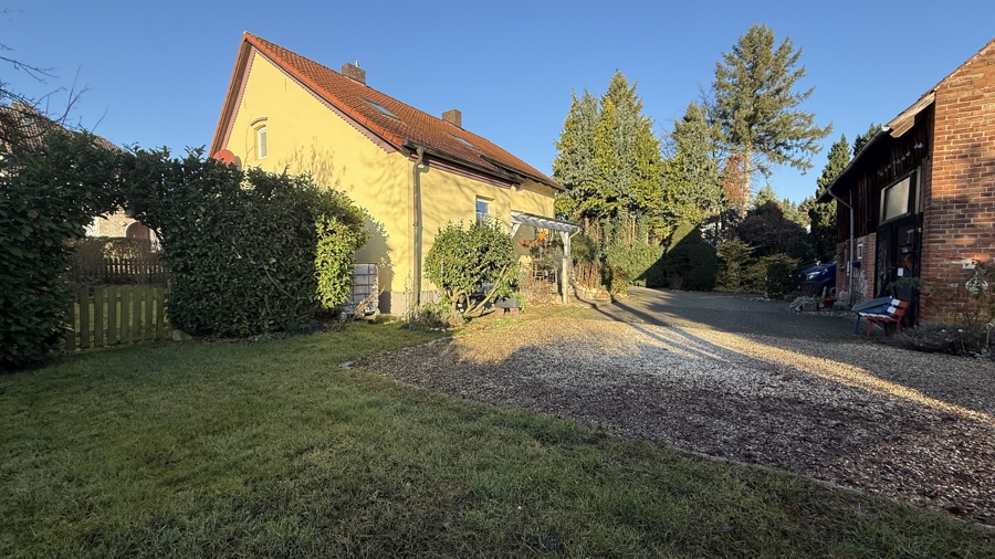 Hinter der charaktervollen historischen Haustür dieses um 1910 errichteten, verputzten Wohnhauses öffnet sich ein gemütlicher Wohnbereich mit zeitgemäßem Komfort. Das Haus mit 160,78 m² Wohnfläche auf einem 1.468 m² großen Grundstück verbindet historischen Charme mit moderner Ausstattung.Der einladende Eingangsbereich führt direkt in einen freundlichen Flur, der als zentraler Knotenpunkt des Erdgeschosses dient. Rechter Hand öffnet sich ein praktisches Durchgangszimmer mit angrenzendem Schlafzimmer – ideal für Gäste, Homeoffice oder einen privaten Rückzugsort. Geradeaus gelangt man ins großzügige Esszimmer, das als kommunikatives Herzstück fungiert und nahtlos in die Küche überleitet. Vom Esszimmer aus erreicht man zudem die überdachte Terrasse, die den Wohnbereich geschickt mit dem Garten verbindet.